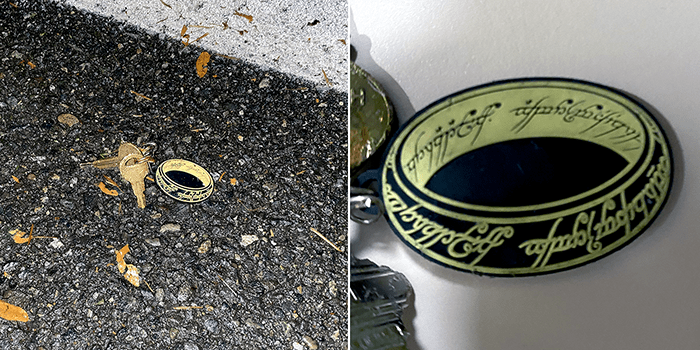 The key fob is unique and looks to be three dimensional, but it’s an oval disk. Google Lens wouldn’t even try to translate the text, but it was able to match images for us to determine it is a ring from the Lord of the Rings.