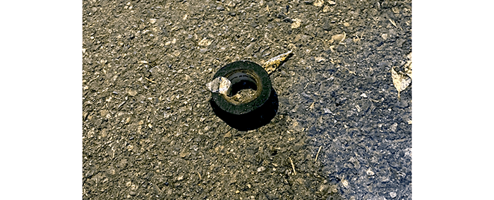 A hardly runover role of electrical tape. We’ll add it to our other eight rolls of electrical tape we’ve found.
