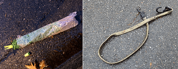 An unused dusting wand with a broken handle on Brickyard Road and another tiedown strap on the freeway onramp.
