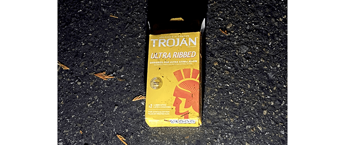 An empty twelve-pack of ultra ribbed condoms. Fortunately, though, no used condoms were around.