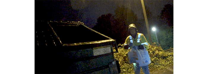 Speaking of the dumpsters, Janet took a bag of trash and tossed it into the dumpster.