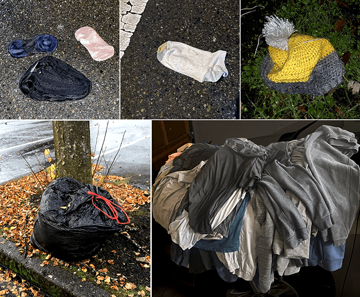 At the parking lot in Bothell, we picked up two nonmatching socks and a black cap then a yellow kid’s knit cap nearby. Later, on Riverside Drive, another sock which may have matched one of the parking lot socks, but we had already tossed them. At the park-and-ride, there was a large black bag with a lot of clothing in it. The clothing was washed and folded. When we arrived home, Janet made an inventory of the items: