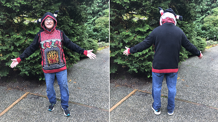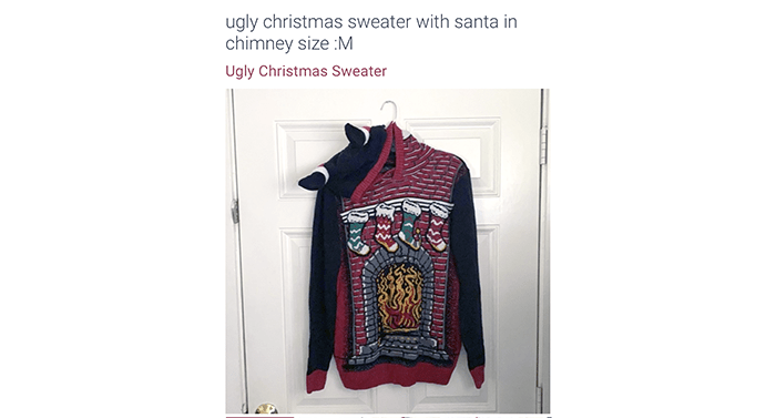 The hood has Santa’s legs like he was going down the chimney. So, Chuck decided to use Google Lens to find more about the sweater and it found this.