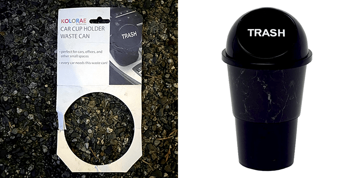 Someone purchases a fifteen-dollar Car Cup Holder Waste Can and then litters the wrappings. What the heck? Oh, right, if you fill it, you need to empty it, good thinking.