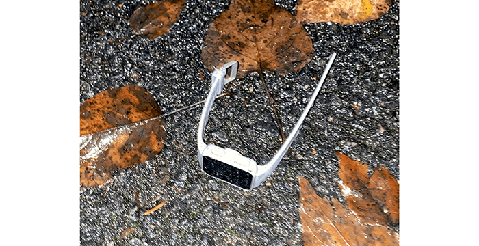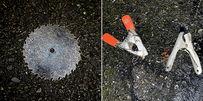 Another well-runover circular saw blade. Now that we look at it, it looks like it could be a piece of art. Too late. We recycled it. We also found a pair of clamps. Unfortunately, they had also been runover and well clamped. They also joined the saw blade in the recycle. The saw blade says, “I’m cutting-edge technology!” The clamp replies, “I’m the one who really brings things together.” Well, not anymore.