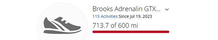 They recommend a 400-mile maximum which we would do too if we were selling shoes. But we set our limit at six-hundred miles, then overrun it before we get the new shoes. Anyway, we now have a nice new shiny pair.