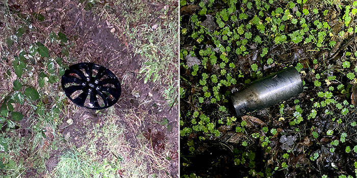 Someone ran off the road and lost a wheel cover. It’s in great condition, so if you know someone who owns a Hyundai and is missing a hubcap, let us know. We also found one of those annoying tailpipe sound enhancers. If you know someone who lost one of these, forget it, we’re not giving it back. In fact, we recycled it.