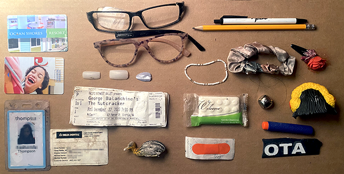 A kid’s bracelet, and a bar of hotel soap and an orange bandage, both unopened. A couple of writing implements, and some hair control devices, one with hair still in it and the other with a rose. Then, some toys, a Nerf bullet, a bell and part of a McDonalds Happy Meal toy. After some searching, we found it was Darla’s hair of the McNuggets Buddies.