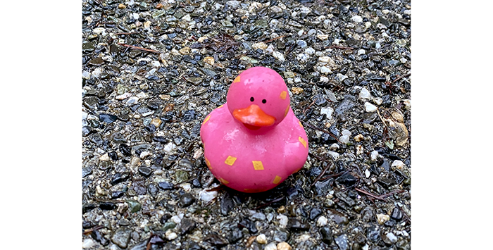 That is, a rubber duck. This is the tenth we’ve found, all different and all from the same factory in China. They are sold at the Dollar Tree and must be very popular based on the number we find.