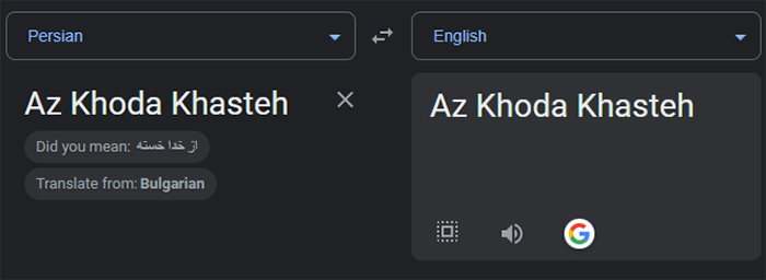 We cleaned it up and listened to parts of five of the seven tracks, the other two were unplayable which is fine because the music is not our cup of tea. However, we wanted to get more information, so we fed the title, “Az Khoda Khasteh” to Google Translate: