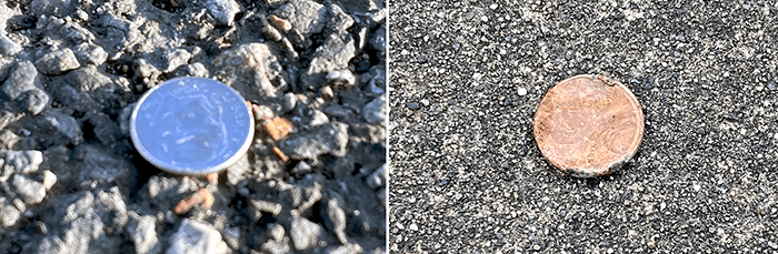 A dime on the freeway onramp and a penny in the gutter along Juanita-Woodinville Way. They were both found by Chuck making partial amends for his miserable showing this week.