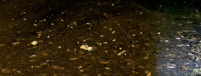 This was in one driveway on Riverside Drive. Three empty cigarette packages and a whole bunch of butts. We picked them up, but if the butthead does it again, we’re leaving them.