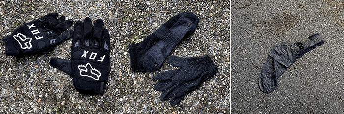 A nice pair of Fox Racing Dirtpaw gloves, another single glove and sock, and another sock that does not match the first one. Also, three hats.