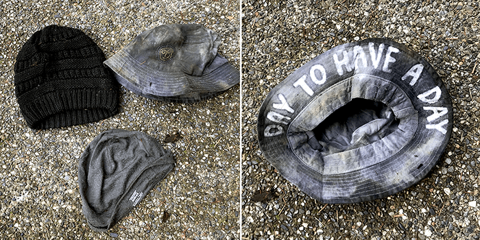 A knit cap and a wool beanie and what looks to be a fishing hat. Under the brim is “DAY TO HAVE A DAY.” We have no idea what that means.