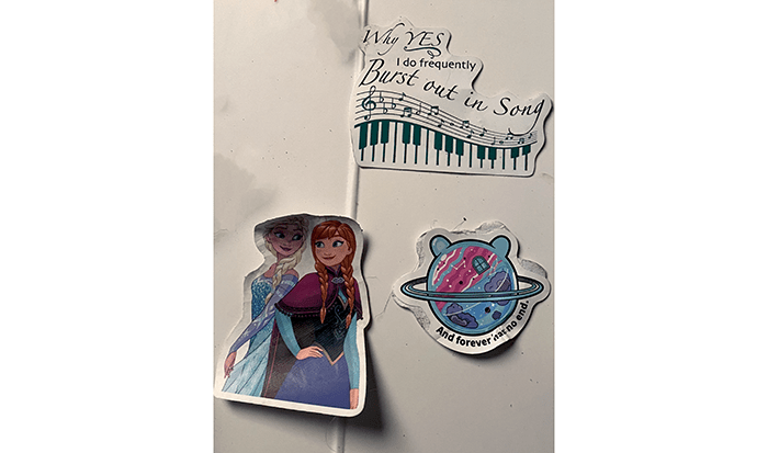 Why Yes, I do frequently Burst out in Song. So, how’s that working out for you? And, of course, a Frozen sticker and an astronaut And Forever Has No End sticker. That makes no sense. Forever obviously ends in ever.