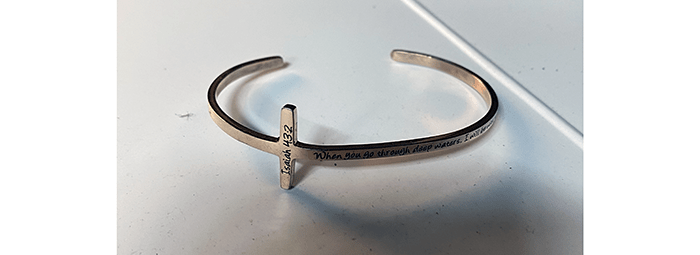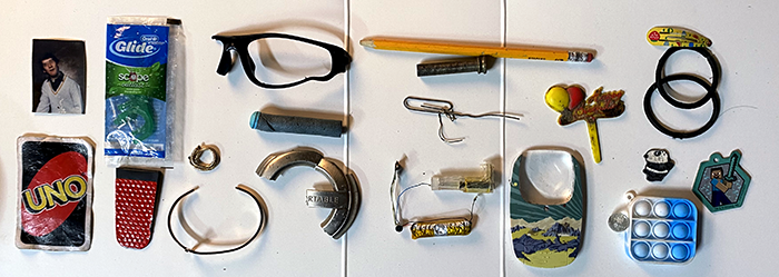 A piece of a glasses frame with no lens, a Nerf bullet, a car part with “rtable” showing but we couldn’t identify it. What may be a crushed piece of jewelry and a religious bracelet.