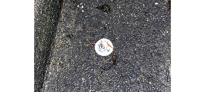 Across the street in front of the apartments, the two couch sections are still there after several months. We routinely pick up coffee cups and other trash that people toss behind the couch. Do they do that at home? However, today was a first.