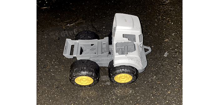 At the parking lot in Bothell, we found a broken toy behind the dumpsters.