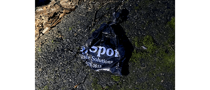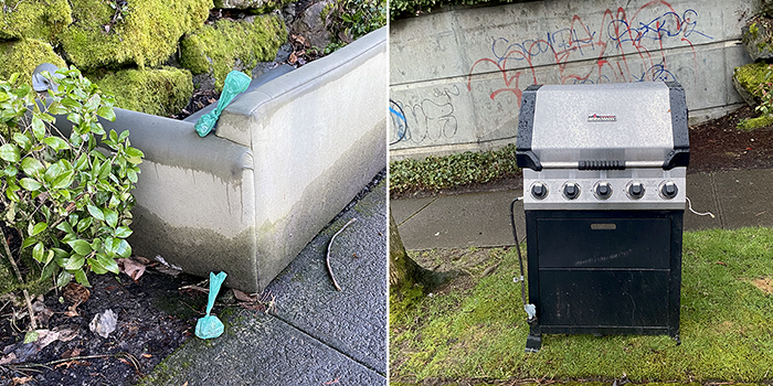 Dog poop bags. Also, a barbecue grill that someone abandoned. Some of the people who live here take no pride in their neighborhood. And that includes the people tossing their trash into the berry bushes.