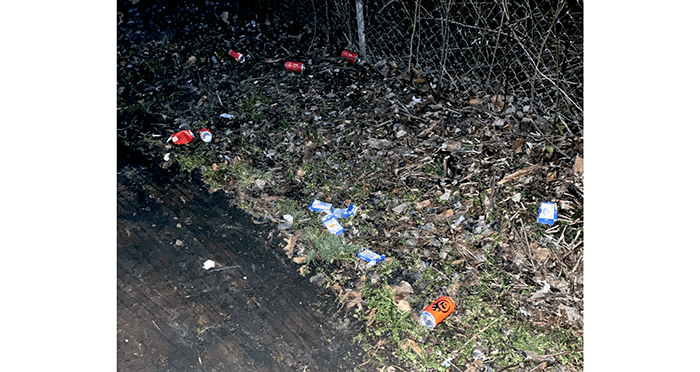 A bunch of beer and wine cans, five empty Camels Cigarette packs and the butts to go with them.