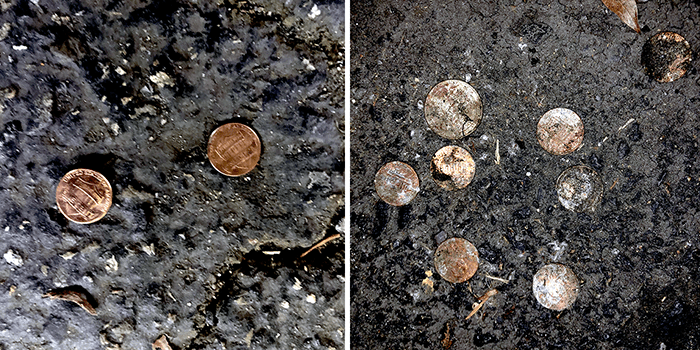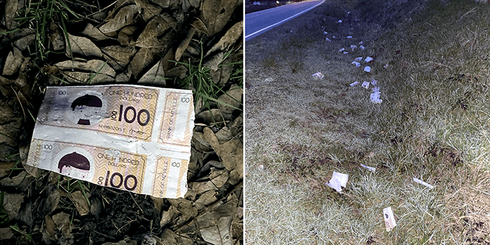 We found a quarter in the gutter near a services station driveway and another quarter and a nickel close to each other about a half mile away.