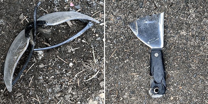 Another pair of safety glasses and a knife. Google thinks it might be a Takamura Migaki Japanese Santoku knife, but we’re pretty sure it’s a run-over putty knife. But if you are willing to pay $150 for it, let’s talk.