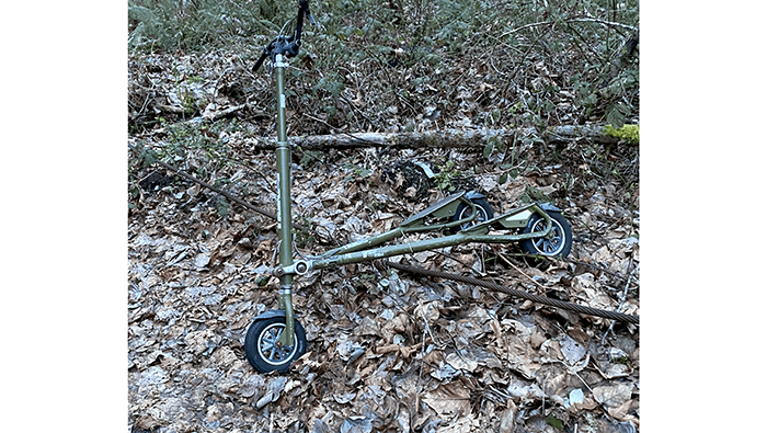 On Simonds Road, someone dumped a three-wheeled “Wiggle” scooter.