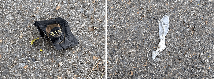 Another condom by the metered freeway onramp. First, we found the wrapper then about a hundred feet further on, we found the condom.