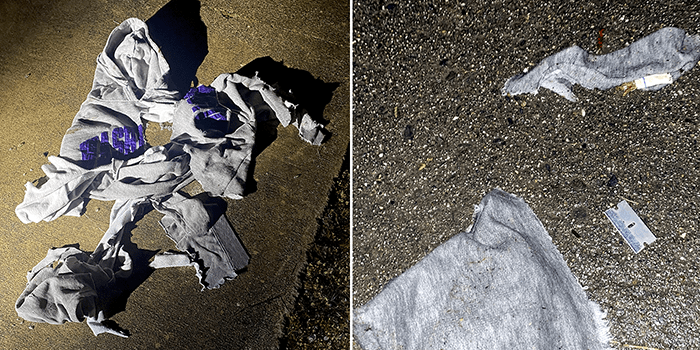 It was a University of Washington hoodie and as we picked up the pieces, there was a razor blade. That may have explained the extreme damage to the shirt. Did someone not get accepted to the university?