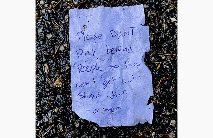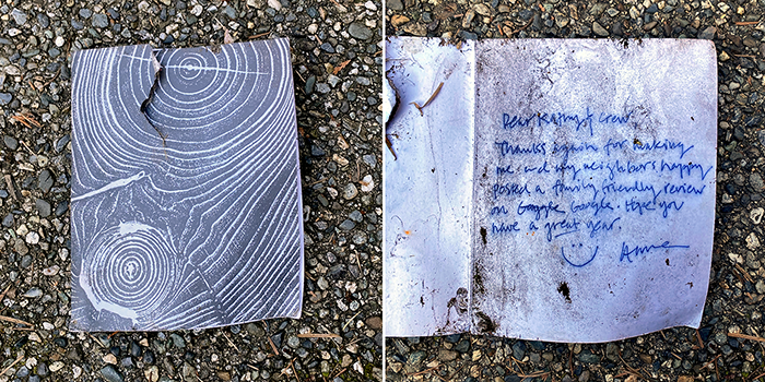 Also, at the park-and-ride, someone tossed a thank-you card.