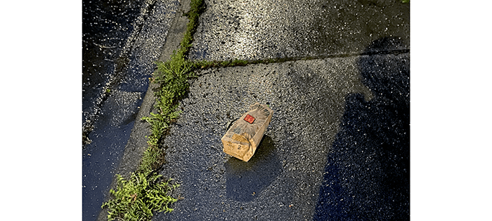 We had walked all the way down Juanita-Woodinville Way past Safeway and were on our way back. On the other side of the street, we saw a bag.
