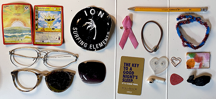Starting in the upper left, a couple of game cards. They are from a company called Metazoo. It started in 2020 and announced in January of 2024 that it was shutting down production. These might be valuable collectors’ items, but don’t hold your breath. To the right is a sticker for ION, a company that makes products for surfers, and below are some glasses parts that don’t match.