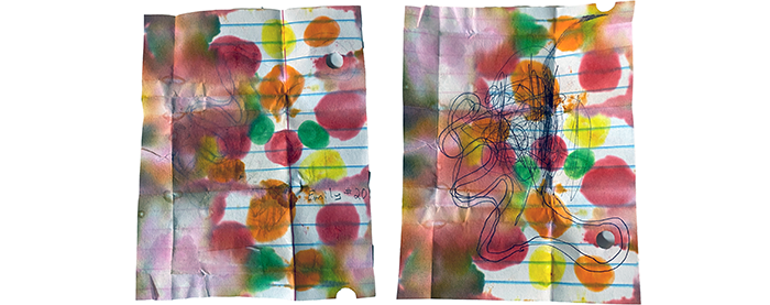 It was decorated with colorful spots and some artwork. One side was labeled “Emily #20,” obviously the artist’s numbered prints. The other side looks like a snake in the grass with its tail artistically wrapped around the binder hole. We may have it framed.