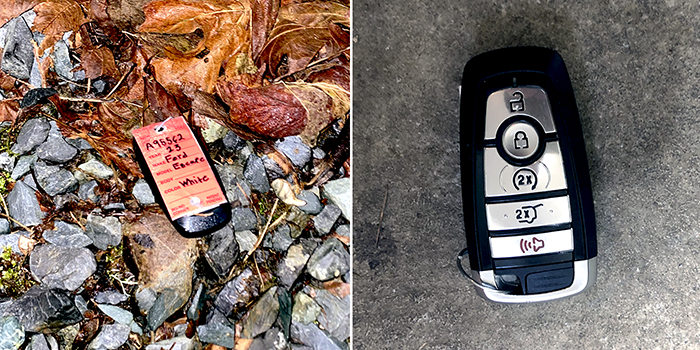 It had a dealer tag on it for a 2023 Ford Focus. Unfortunately, there is no dealer name, so there is no way to find out. Well, we could visit all fifteen or twenty Ford dealerships in the area and wander around pressing the alarm button, but then, it could be a used car. We’ll just put it in our lost-key jar.