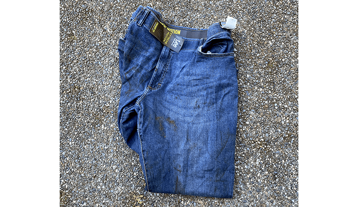 Under a tree on Brickyard Road, we found some discarded jeans.