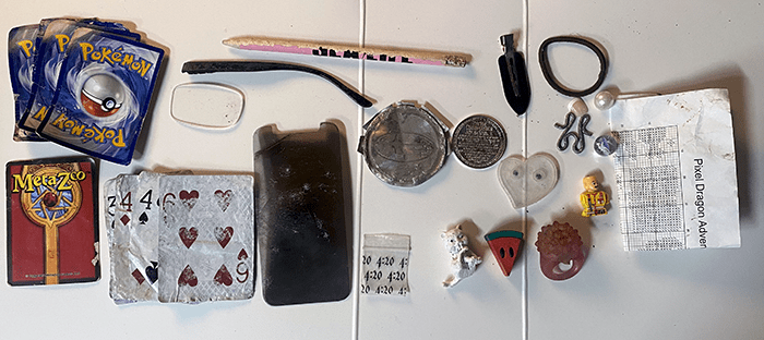 We picked up four playing cards, three, four, four and six. Is it too late to get our ante back? Then a writing implement, a couple of spectacle parts and a cell phone. But not really, just part of the touch screen assembly. We looked for more parts, but that was it.