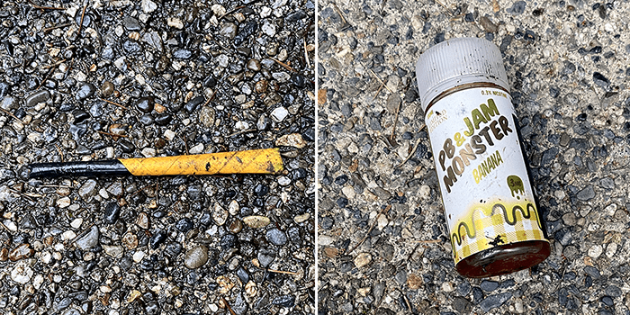 A partially-smoked pre-roll joint and a jar of PB & Jam Monster Banana vaping juice. The vape juice is nearly full and is selling for about thirteen dollars online. We don’t partake of this stuff, so if anyone is interested, we will let it go cheap. Say, both for five bucks? Let us know.