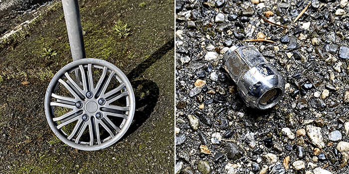 A generic wheel cover in good condition. We left it in plain sight on the off chance that the owner will see it. However, we will probably pick it up next week. Hopefully not in pieces in the middle of the street. The lug nut did not come loose, the wheel stud sheared-off, probably due to over-tightening. Not good.
