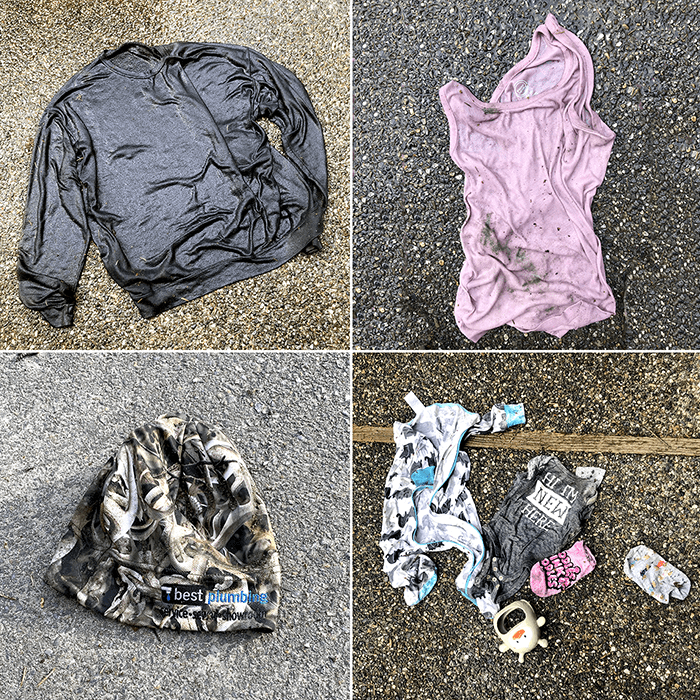 A sweatshirt on Riverside Drive, and on the freeway ramps, a pink lady’s tank top, a Best Plumbing cap, and some baby clothes. Why does a plumber’s cap need to be camouflaged, anyway? There was also a teething toy with the baby clothes.