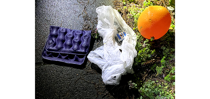 Great, an orange-delivery tray, a plastic bag, and a ball. The ball looked like a giant orange that tied the scene together. There was also a small box of raisins. That made the whole effort worthwhile. The density of the trees and berry bushes was such that we could not toss the ball over the fence, so we walked until there was a clear view of a random fence and tossed the ball over. Let them deal with it.