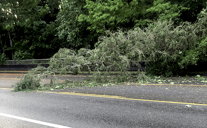Our theory is that one of the cans we removed was somehow holding up the tree, so it was our fault that it fell. We contacted 911 Emergency and reported that the tree was in the travel lane and cars were driving around it. We did not mention that it was our fault.