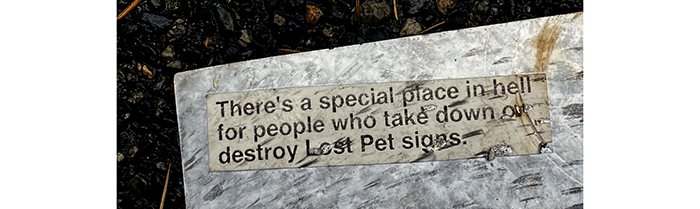 We pick up a lot of abandoned signs, but we seldom take any that are still up. Today we picked up a downed missing cat sign that had a notice on the back.