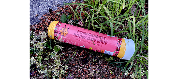 POMEGRANATE HONEY DEW WHIP. We found these in several flavors such as watermelon, bubblegum, and blueberry. It took us a while to figure out that these were large nitrous oxide (N2O) containers and the flavors referred only to the color of the tank. We find a lot of small N2O cartridges that people use to get themselves high. Those typically contain eight grams. This canister contains 2 kilograms (4.4 pounds) or the equivalent of 250 small cartridges. At about ninety dollars apiece, you wouldn’t think anybody is buying these tanks to get high. Think again, they sell them at smoke shops.
