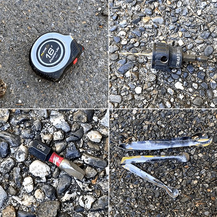 A tape measure on the freeway onramp, a Smart Bit drill bit for predrilling and countersinking holes, a square drill bit, and two pairs of run over tongs. And yes, the TrashWalking judges rejected the tongs. We pointed out that they were kitchen tools, but they claimed they were utensils, not tools. Don’t they know people work in kitchens?