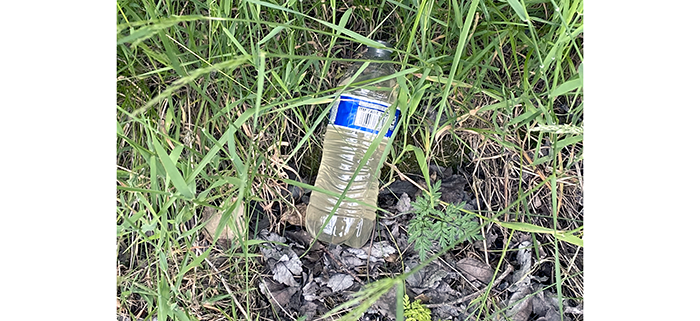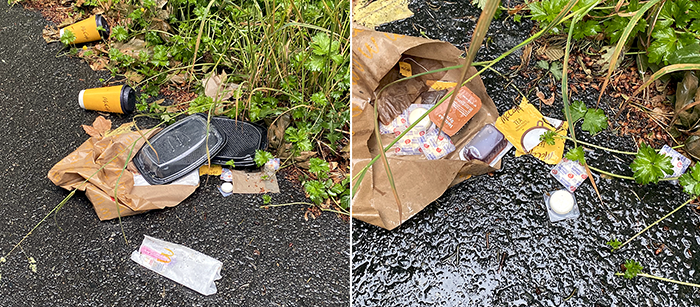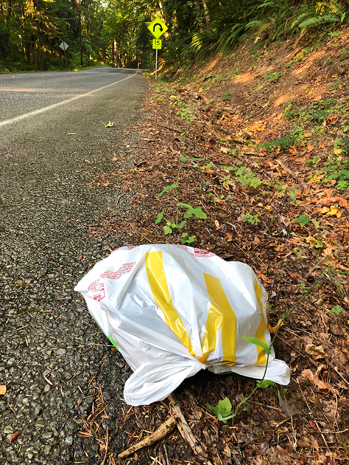 The return of the McLitterers. They were very prolific litterers early in our walks, and, though we have not kept an accurate count, we have picked up well over fifty of their McDonalds bags. They always have the same trash. Two clean trays used for pancakes or waffles, unopened packages of plastic utensils, unopened condiments (butter, syrup, salt and pepper) and two cups with matching used tea bags. The difference now is that McDonalds has quit giving out heavy white plastic bags shown below.