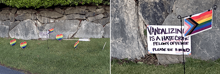 Today, some of the pride signs were gone and the cat sign was down. A new sign appeared. We are not sure if the new Vandalizing sign is because of the pride signs or the cat sign.