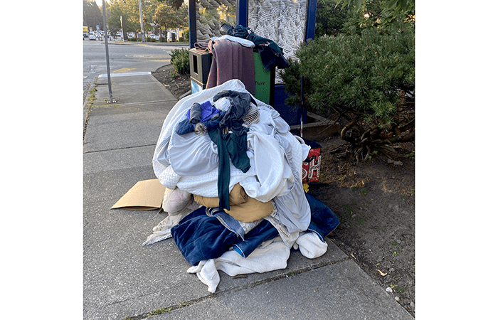 A bunch of bedding, women’s clothes and other random items including a golf club. But why here at the bus stop? Why not at Goodwill just down the street? Another TrashWalking mystery. We did not have the means to deal with it, so we will leave it to the Metro guys.