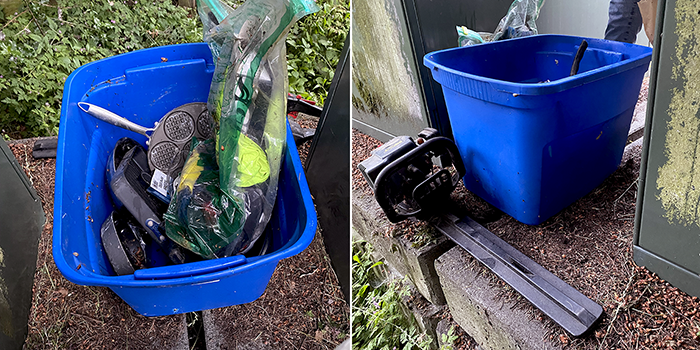 A storage box filled with several items including cooking utensils, clothing, oil and a hedge trimmer. Yet another tool find, and one that the judges can’t argue with even if they did wake up. It was more than we could carry, so we left it. We may come back with the car to retrieve it, but hopefully someone else will get interested.