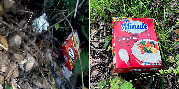 At a bus stop on Juanita-Woodinville Way, we often pick up rubber gloves discarded by a rider. Today we picked a glove out of the bushes and saw a box of rice down a bank.