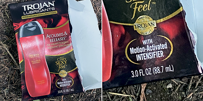 We find a lot of condoms, mostly the Trojan brand. Today we picked up a discarded box for a Trojan personal lubricant, the first one we’ve seen.